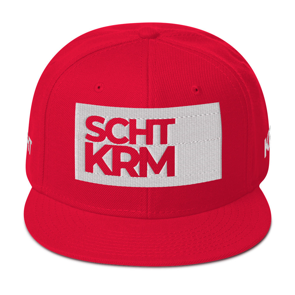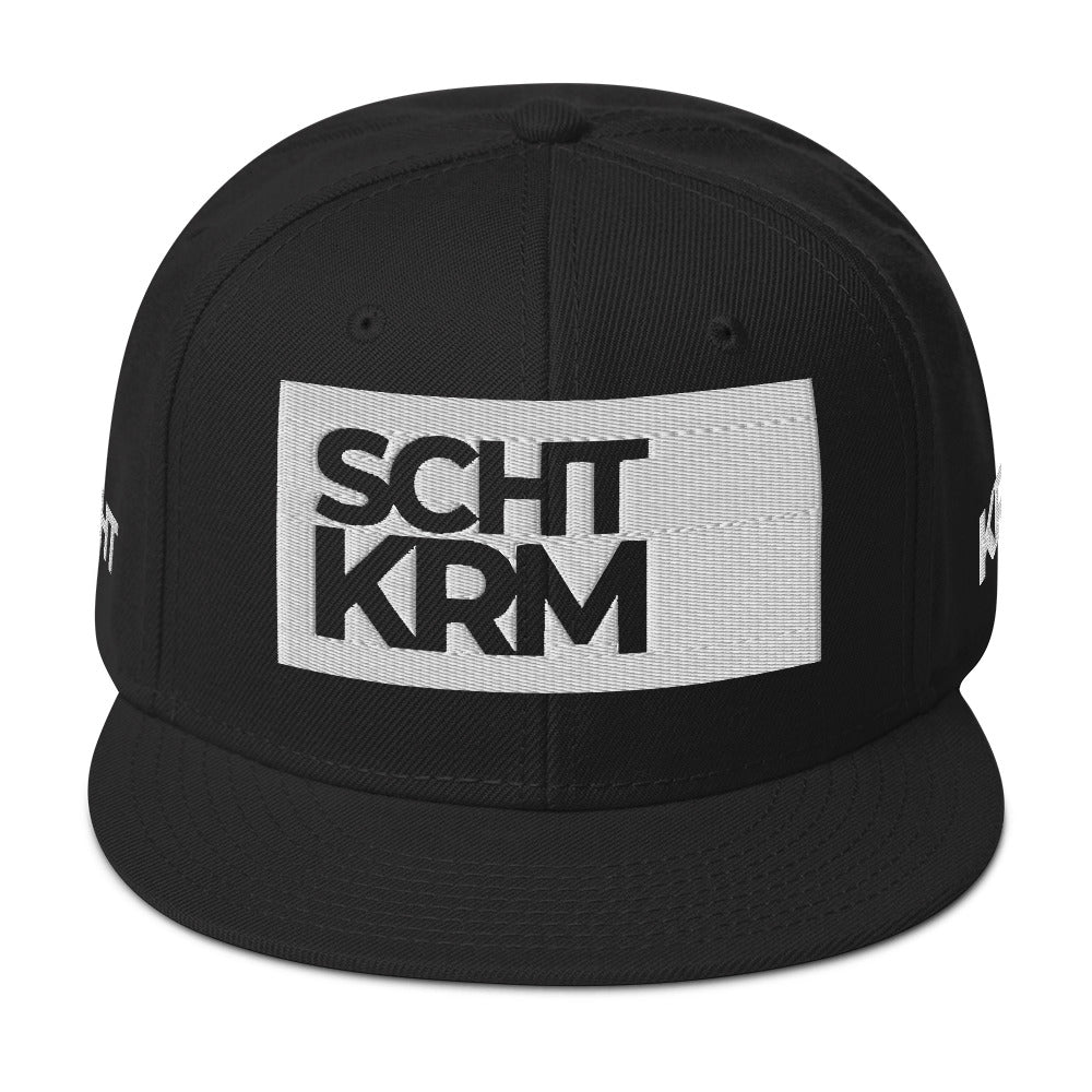 - Snapback Cap mit 3D-gesticktem SCHTKRM-Logo in Weiß